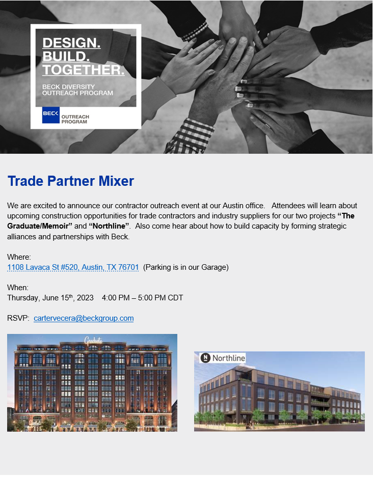 Good Afternoon! I would like to invite anyone interested to our next Trade Partner Mixer on Thursday, June 15th, at Beck's office on Lavaca. Come and here about our future projects, Northline & The Graduate/Memoir, and opportunities to partner with us!